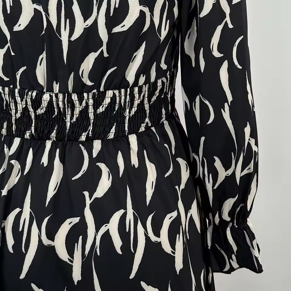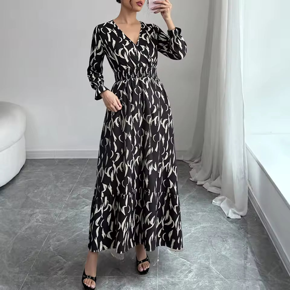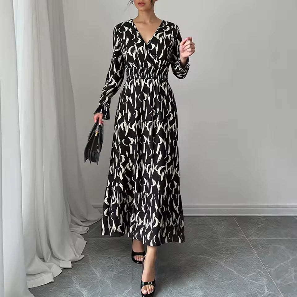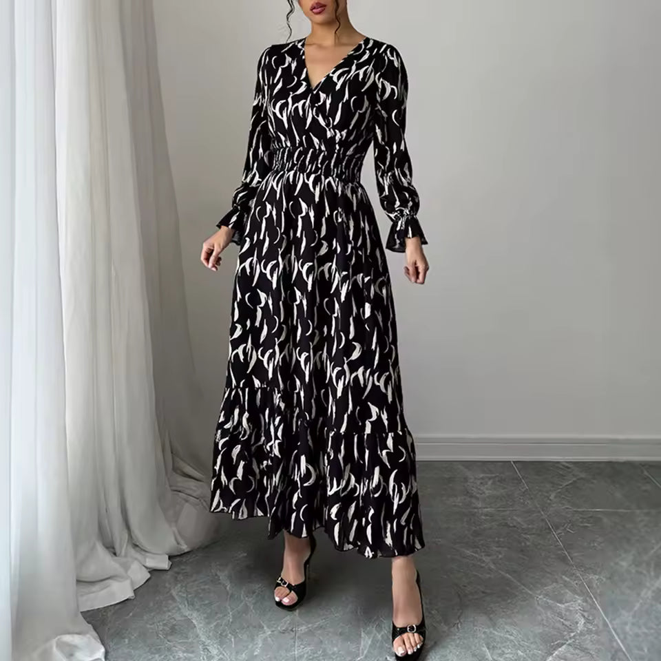 Designed with a flattering V-neckline and long sleeves, this dress offers a graceful and versatile look. It provides light coverage, making it suitable for warm summer days and cooler evenings.